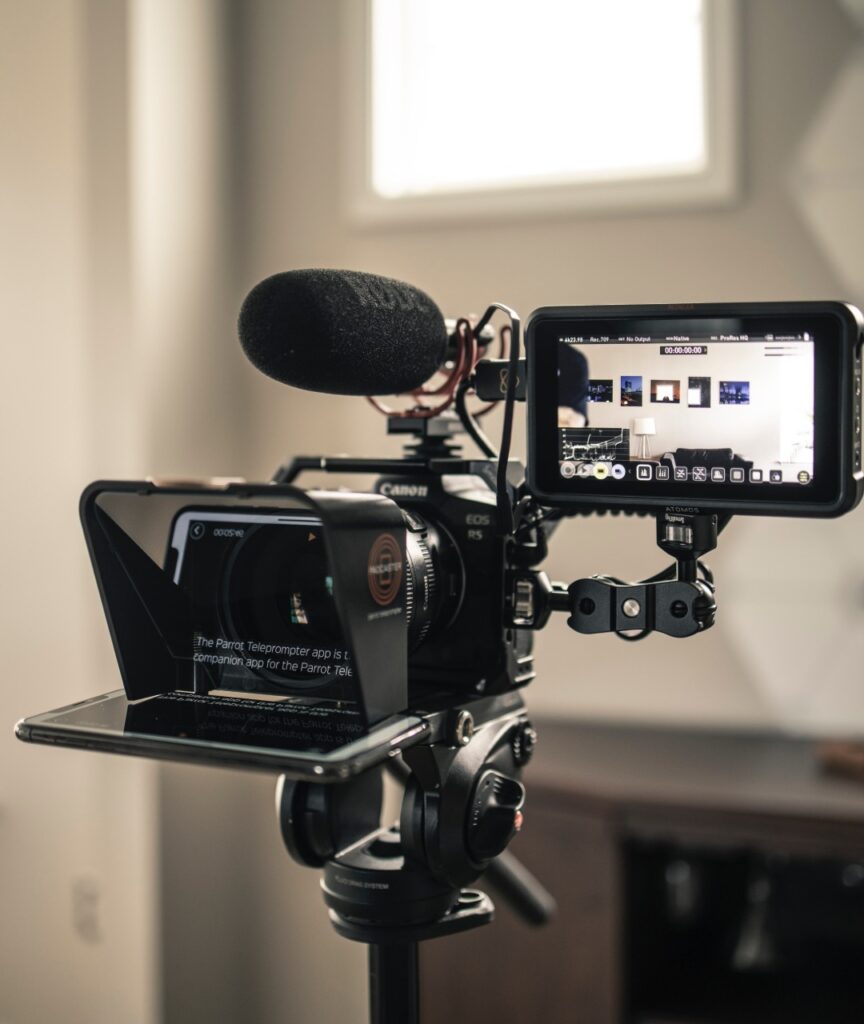 Si vous utilisez des caméras et souhaitez que l’orateur regarde dans l’objectif, vous aurez alors besoin d’un dispositif prompteur se fixant sur le pied de la caméra. La taille de l’écran varie suivant l’éloignement de la caméra.